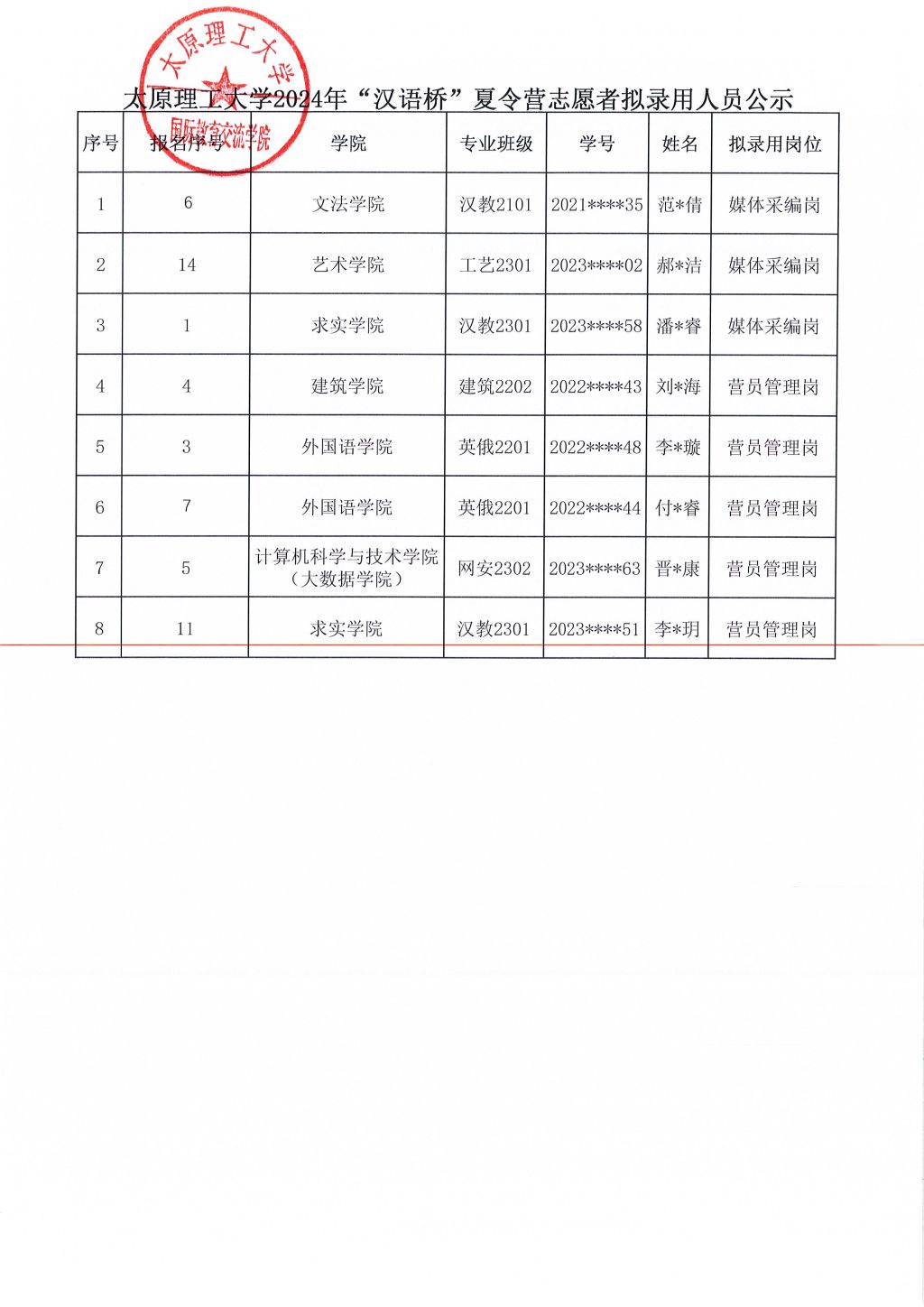 附件:太阳成城集团2024年“汉语桥”夏令营志愿者拟录用人员公示(表)
