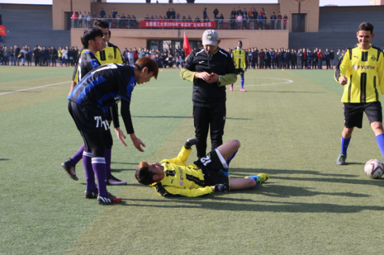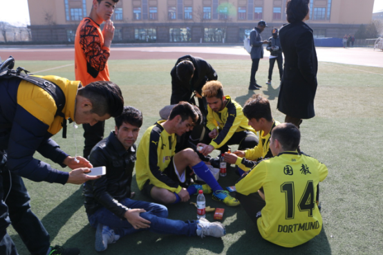 随后进入中场休息阶段。我院观赛师生为球员们送来了香蕉、巧克力和矿泉水,为队员们补充体力,并备好医疗箱,为受伤的球员包扎。