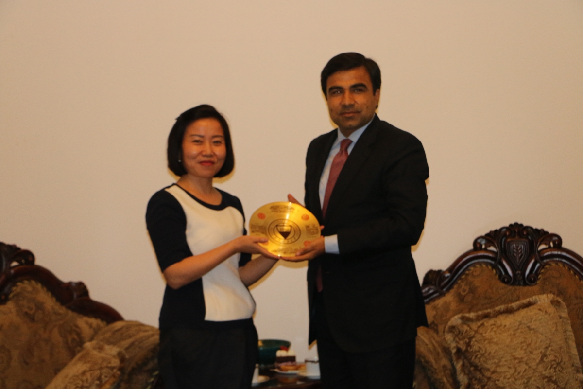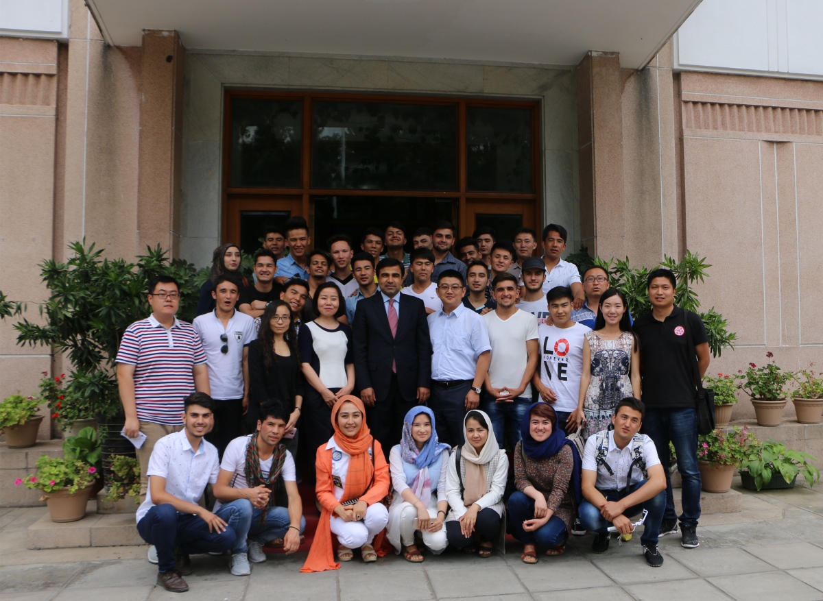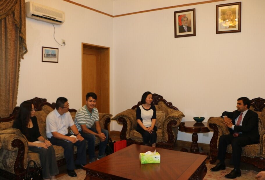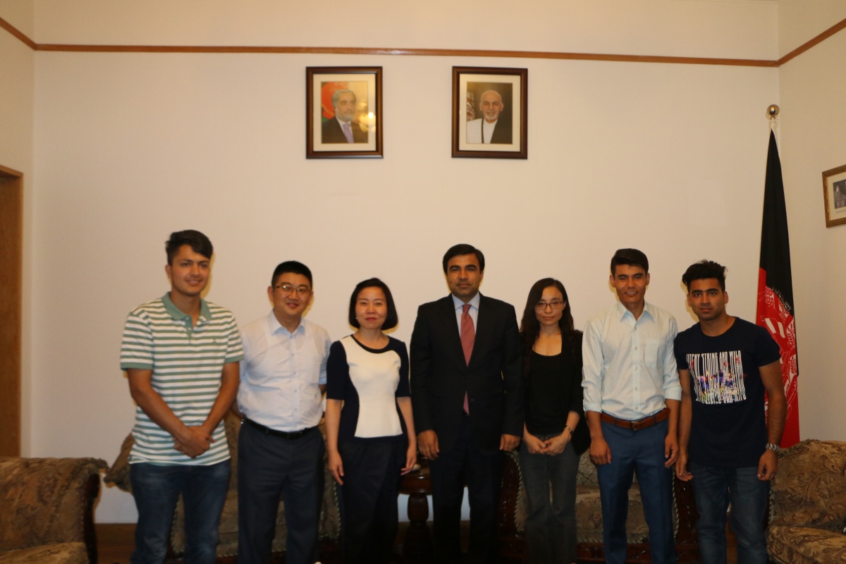 下午,梁丽萍一行又来到阿富汗伊斯兰国驻中国大使馆,受到了大使以及使馆人员的热烈欢迎。我校“阿富汗南亚师资班”学生和带队教师也一同前往,与阿富汗驻华大使某萨扎伊(Mousazai)先生以及使馆人员进行了友好会谈。某萨扎伊大使对梁丽萍一行的到来表示欢迎。他高度赞扬了我校在对阿教育事业上所做出的贡献,感谢我校对阿富汗留学生的悉心培养。梁丽萍副校长感谢使馆方面的邀请,并详细介绍了我校“阿富汗南亚师资班”的教学、管理情况以及所取得的成绩,表示会继续招收和培养更多的阿富汗学生,同时邀请大使先生在合适的机会做客太原,访问我校。期间,大使先生还与我校阿富汗学生进行了交流,了解他们的学习、生活情况。