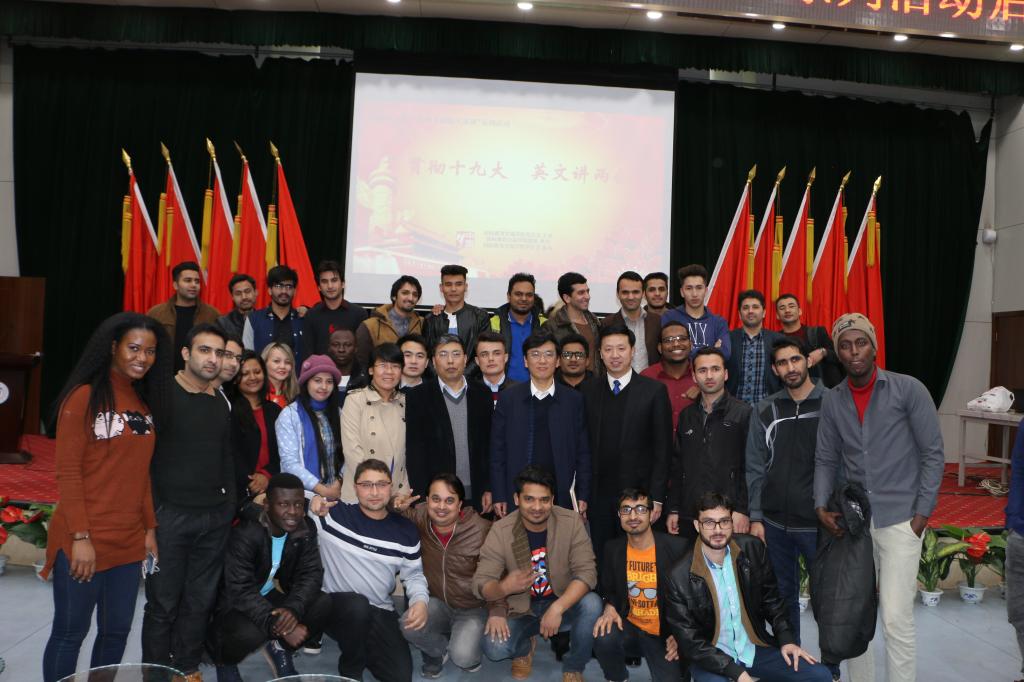 会议首先由张永忠介绍了本次“世界声音话中国,教育国际大家谈”系列活动的宗旨、目标与主要内容,梁卫国副校长随后用英语发表了热情洋溢的讲话。他在讲话中指出,党的十九大对中国教育国际化提出了更高的要求。学校高度重视国际学生工作,学生处、校团委等相关部门将为国际学生学习和生活创造更多的便利条件。作为国际学生,要努力学习中国的语言文化,回国之后,讲好中国故事,传播中国好声音。学生处郝根彦处长在随后的讲话中,对国际学生来我校学习、进行文化交流表示热烈欢迎,希望同学们积极响应习近平总书记构建人类命运共同体的重要外交思想,成为文化交流和友谊的使者,共同为弘扬中华文化和民族精神做出贡献。来自阿富汗国际学生代表李白在接下来的发言中,分享了自己的学习和生活经历,对我校教学和生活条件以及师资队伍的教学水平表示充分肯定,并希望今后能够组织更多的文化活动。本次“世界声音话中国,教育国际大家谈”的第一讲采取党总支书记讲党课的方式,张永忠主要围绕党的十九大主题、报告中的新思想、新论断和新提法,以“党的十九大与国际化”为题做了全英文专题报告。
