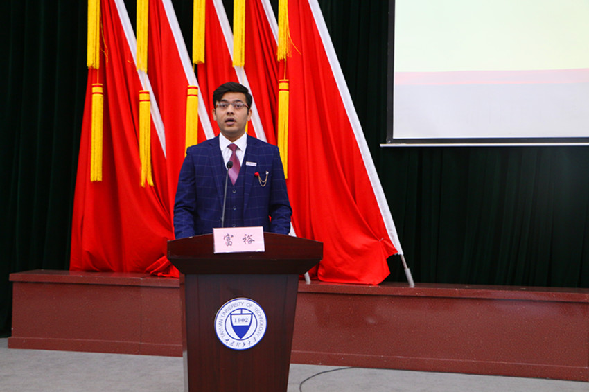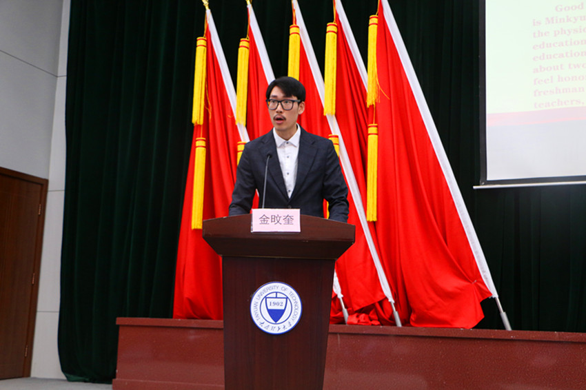 老生代表、来自机械与运载工程学院的巴基斯坦籍学生富裕(MUHAMMAD YOUSAF IQBAL)用中英双语介绍了自己在我校的学习生活经历,并希望在今后的学生生活中与新同学一道,互相学习、互相帮助、共同收获成长的喜悦。新生代表、来自体育学院的韩国新生金旼奎(KIM MINKYU)在发言中分享了自己选择来我校留学的心路历程,并表示在今后的学习生活中将努力奋斗,把握机会,积极探索中国文化。