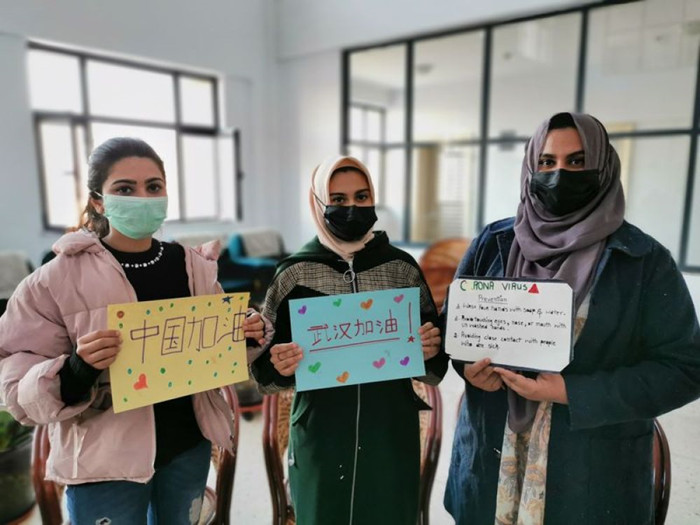 2月4日,山西医科大学留学生石芸(MARVA ASHIQ)和她的姐妹为中国和武汉写“加油”标语。(采访对象供图)