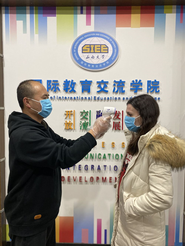 2月5日,山西大学suncitygroup太阳集团负责老师为乌克兰留学生爱玲(BAROK YULIIA)测体温。(采访对象供图)