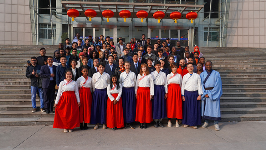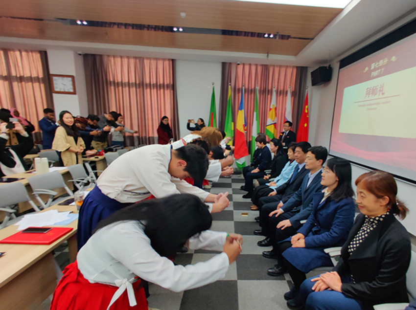 在“开笔礼”环节,新生代表李伟(MUSAVI SAYED M.NASIM,阿富汗籍)手执毛笔,在吕永康的指导下书写汉字——“人”,寓意在今后的人生道路上求学先做人,“学做真人、通情达理”;在“拜师礼”环节,全体学生面向老师行“鞠躬礼”,切身感受中华文化“尊师重教”的传统美德。