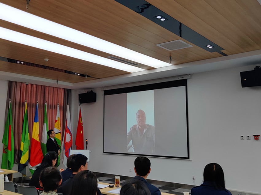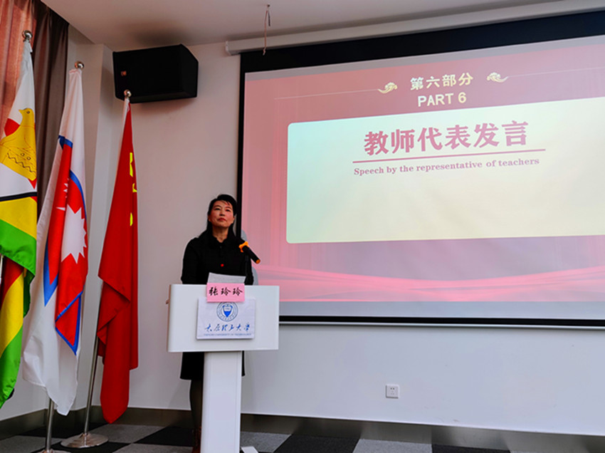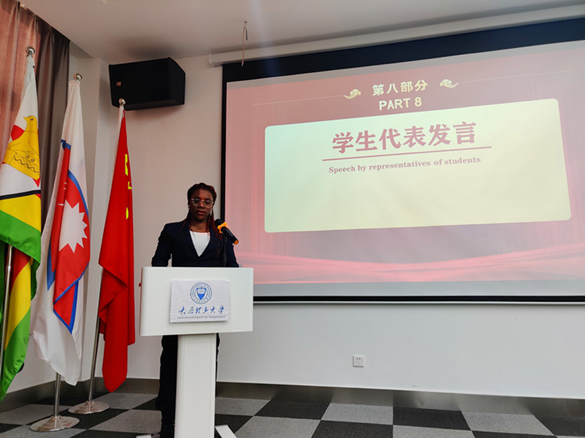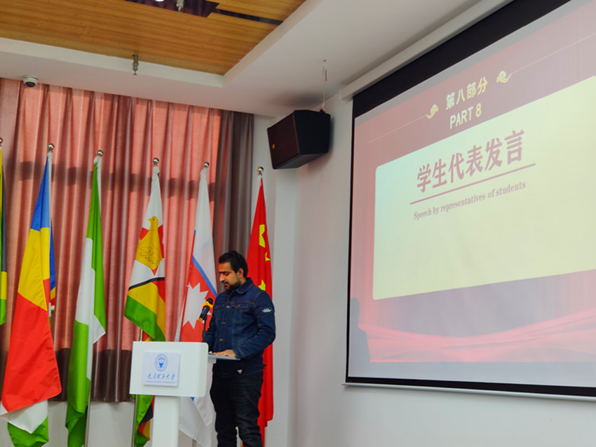老生代表、来自经济管理学院的文心(UCHENWOKE OGOCHUKWU NNEKA,尼日利亚籍)回顾了自己来华留学的初心,她谈到“既然选择了太阳成城集团,就要沉下心、克服困难,学好中文和专业知识”;新生代表、来自电气与动力工程学院的阿石(NIAZ ASHFAQ,巴基斯坦籍)在发言中分享了自己选择来我校留学的心路历程,并表示在今后的学习生活中将努力奋斗,把握机会,将所学知识运用于浇灌中外友谊。来自矿业工程学院的境外学生代表秦邵峰(CHISHIMBA TRESPHORD,赞比亚籍)通过网络视频同大家分享了线上学习感受。