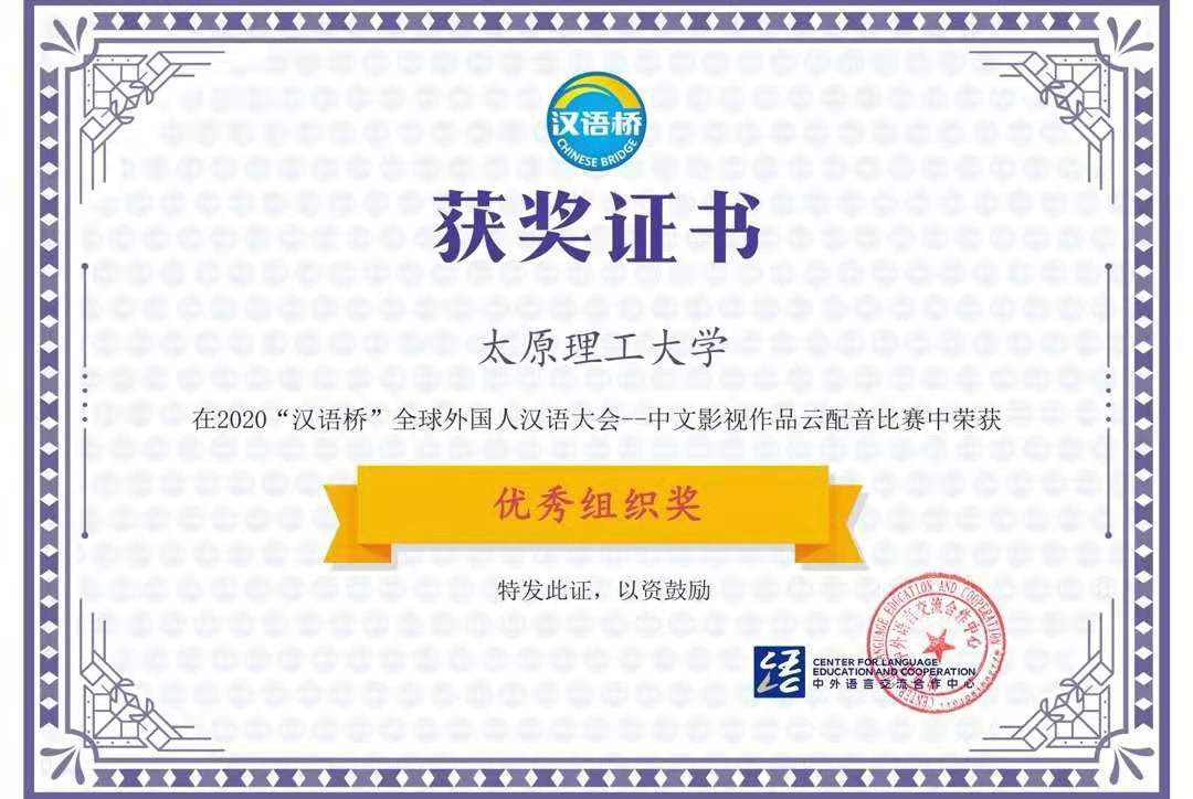 近日,由教育部中外语言交流合作中心、中央广播电视总台联合主办,“汉语桥”俱乐部、中文联盟承办的2020“汉语桥”全球外国人汉语大会——中文影视作品云配音比赛落下帷幕。经过评选,我校荣获“优秀组织奖”,李文彬等七位老师荣获“优秀指导教师”称号,王大志(巴基斯坦)等六名国际学生获得优秀奖。