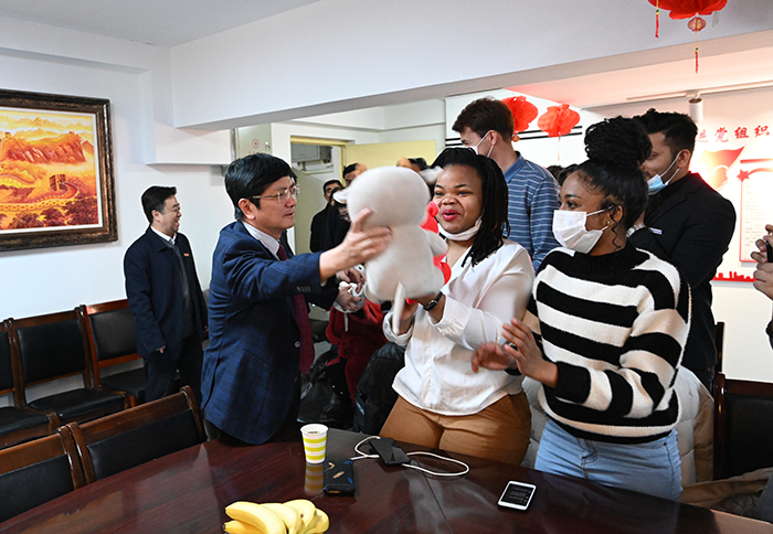 在留学生公寓,郑强将牛气冲天玩偶送到每位留学生手中,并与大家围坐在一起。“很多同学自疫情出现以来就没有回过家,母校也是家,学校将为大家的学习生活提供一切保障。”郑强希望大家多交流、多沟通,保持愉快的心情、保持良好的状态,在学校度过一个开心、快乐、难忘的中国年。