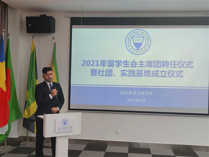 校留学生会主席富裕(IQBAL MUHAMMAD YOUSAF,机械与运载工程学院机械工程专业2020级博士研究生)代表主席团作表态发言,表示将带领留学生会全体成员团结协作,增强向心力和凝聚力;树立服务意识,努力在老师和学生之间架起的桥梁;开展多元校园文化活动,丰富校园生活。