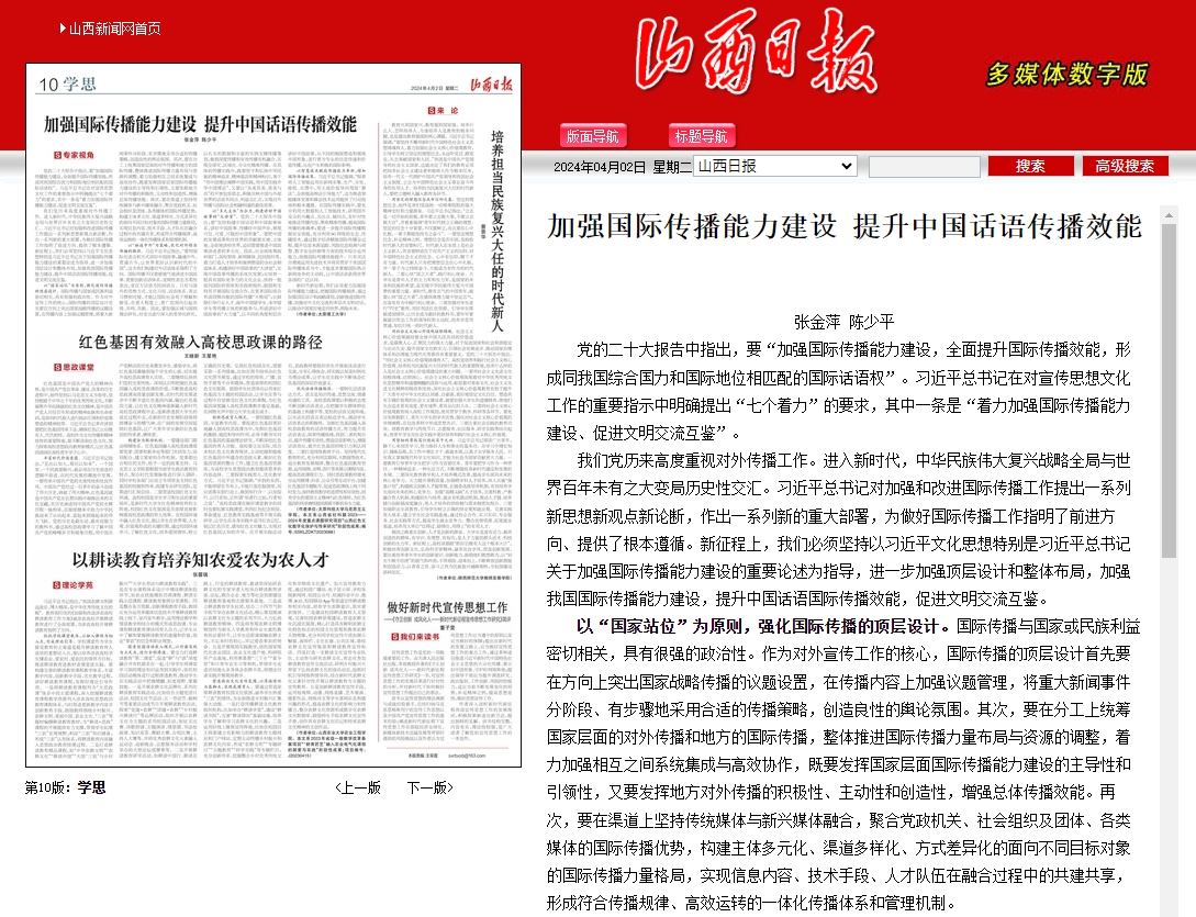 近日,由文法学院教师张金萍、suncitygroup太阳集团院长陈少平共同撰写的文章《加强国际传播能力建设 提升中国话语传播效能》在山西日报发表。该文章系统阐述了新时代加强国际传播能力建设的意义和路径。近年来,学校高度重视宣传思想工作,持续提升教职工的理论研究水平和国际传播能力,为建设综合性研究型高水平一流大学营造和谐稳定良好氛围。