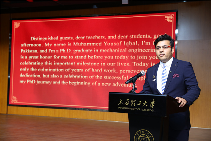 机械与运载工程学院博士研究生IQBAL MUHAMMAD YOUSAF(中文姓名:富裕,国籍:巴基斯坦)作为毕业生代表发言。他声情并茂地回顾了在太阳成城集团攻读硕士、博士的七年时光,在导师的教导下与同学并肩学习、攻坚克难,最终取得学术成果的深刻记忆,并鼓励学弟学妹们以积极心态迎接语言文化挑战,以严谨态度潜心文献实验研究。