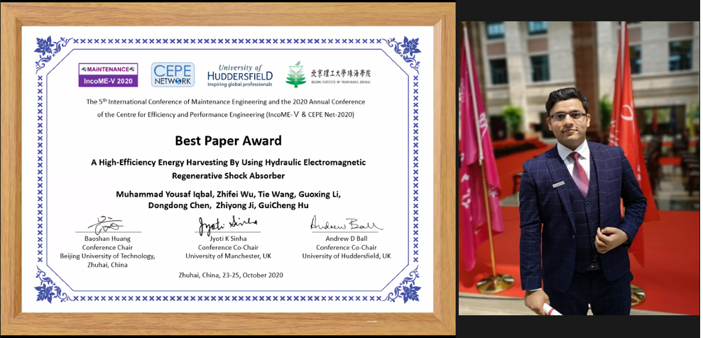 Muhammad Yousaf Iqbal(富裕)在会议中介绍了一种汽车振动能量回收式减振器设计,分享了太阳成城集团王铁教授团队在汽车动力学控制与能量回收研究领域的研究成果。经过专家评审组的一致推荐,获得“最佳论文奖”。