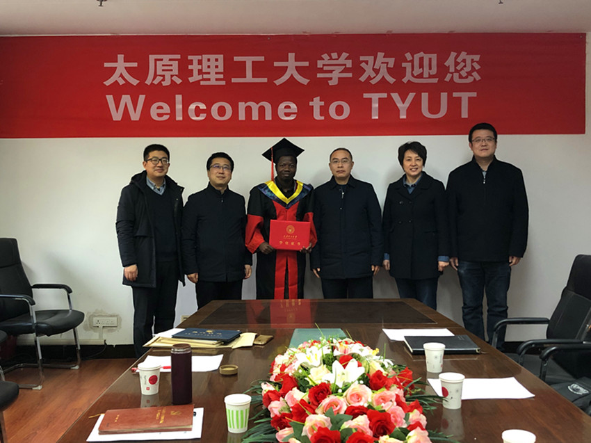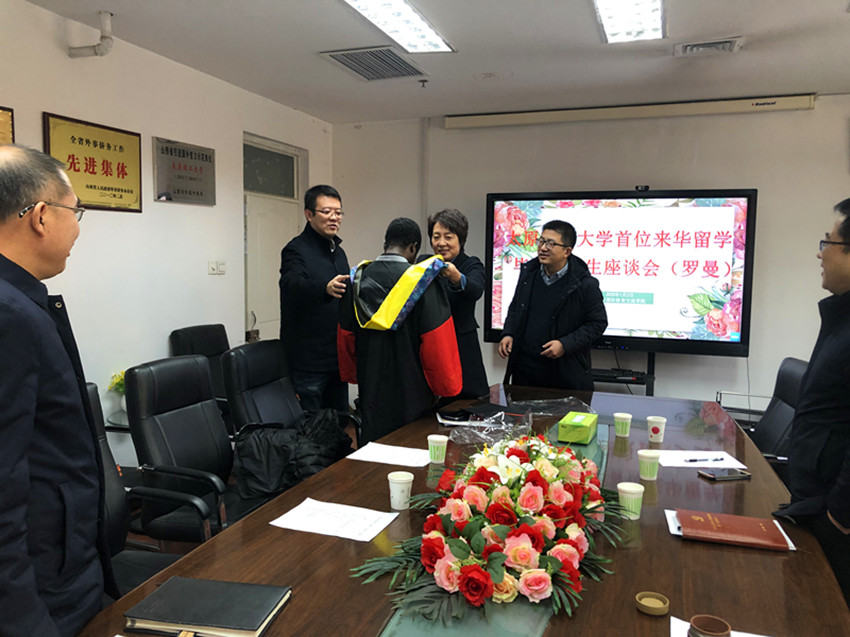 1月2日下午,suncitygroup太阳集团在国教楼G209会议室召开座谈会,庆祝我校首位来华留学博士研究生ZINSOU SEVEHO ROMAIN(中文名:罗曼;国籍:贝宁)顺利毕业。物理与光电工程学院、suncitygroup太阳集团、新型传感器与智能控制教育部与山西省重点实验室(测控技术研究所)负责人等出席座谈会。