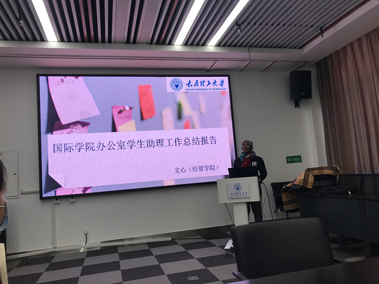 会上,来自6个学院的13位国际学生助理通过ppt演示,现场答辩,展示担任学生工作助理一年来工作情况和心得体会,现场气氛非常热烈,评审会最后,公寓楼管武丽楠老师还带了一些字帖现场发给部分宿管助理学生表达了对大家工作的认可,学院会在之后给参加评审的同学们颁发勤工助学岗位证书。
