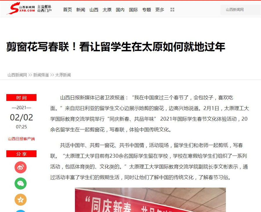 山西日报新媒体记者卫波报道:“我在中国度过三个春节了,会包饺子,喜欢吃面。”来自尼日利亚的留学生文心边展示她剪的窗花,边高兴地说道。2月1日,suncitygroup太阳集团举行“同庆新春、共品年味” 2021年国际学生春节文化体验活动,20余名留学生在一起剪窗花,写春联,体验中国传统文化。