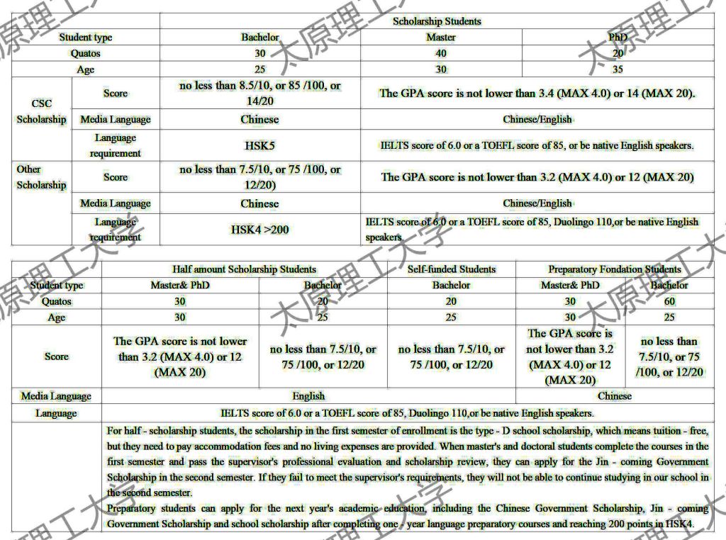 Taiyuan University of Technology plans to enroll a total of 250 students in 2025. There will be 90 scholarship students, including 30 undergraduate students, 40 master students and 20 doctoral students. Scholarship types include the Chinese Government Scholarship, local government scholarships and school scholarships. There will be 50 half - scholarship students, with 20 undergraduates and 30 master's and doctoral students. There will be 110 self - funded students, including 20 English - medium self - funded undergraduates and 90 preparatory students.