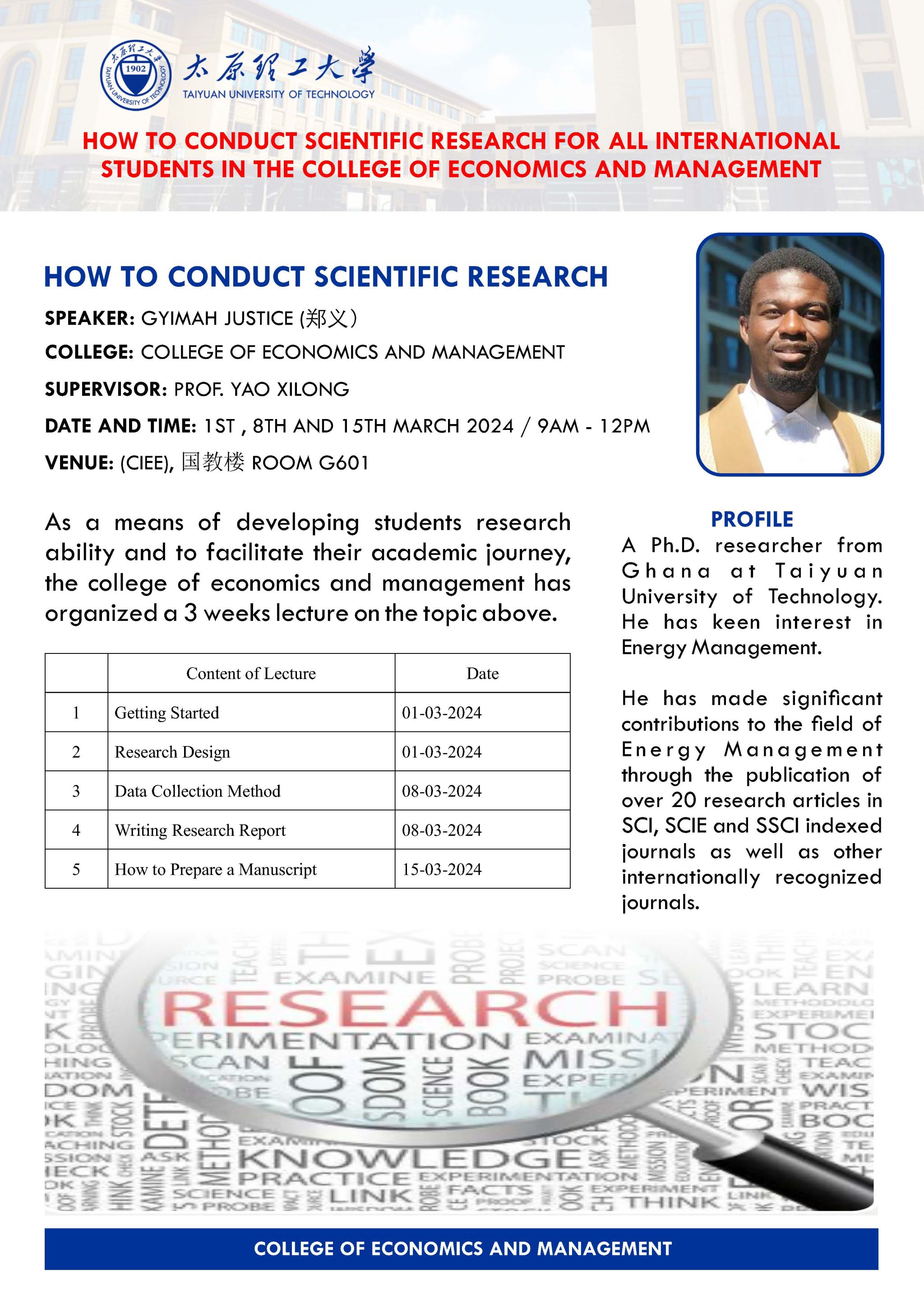 本讲座由经济管理学院副院长姚西龙指导,旨在培养在校来华留学生的研究能力和促进他们的学术旅程。计划从入门、研究设计、数据收集方法、撰写研究报告、如何准备手稿等五个方面进行3期的讲座。